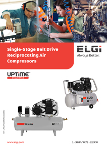 The Single-Stage Belt Drive Reciprocating Compressors are designed for continuous duty application. These single-stage cylinder belt-driven reciprocating compressors are reliable workhorses and can generate up to 10 bar g pressure suitable for most industries and automotive applications. Compared to other reciprocating compressors, belt-driven reciprocating compressors are well known for their durability through intermittent usage patterns.ELGi piston compressors are energy efficient, compact, silent, flexible, reliable, and offer low maintenance costs.