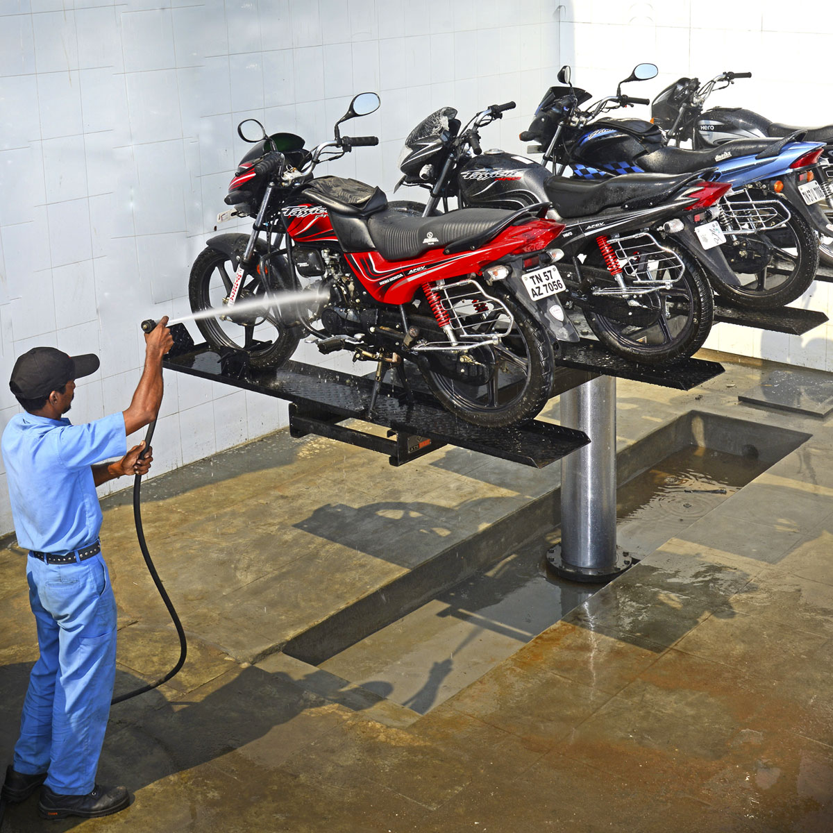Two wheeler washing lift provides smart way to wash two-wheelers. This system is designed to wash four vehicles at a time resulting in saving of time and water. This installation will support both indoor & outdoor operation.